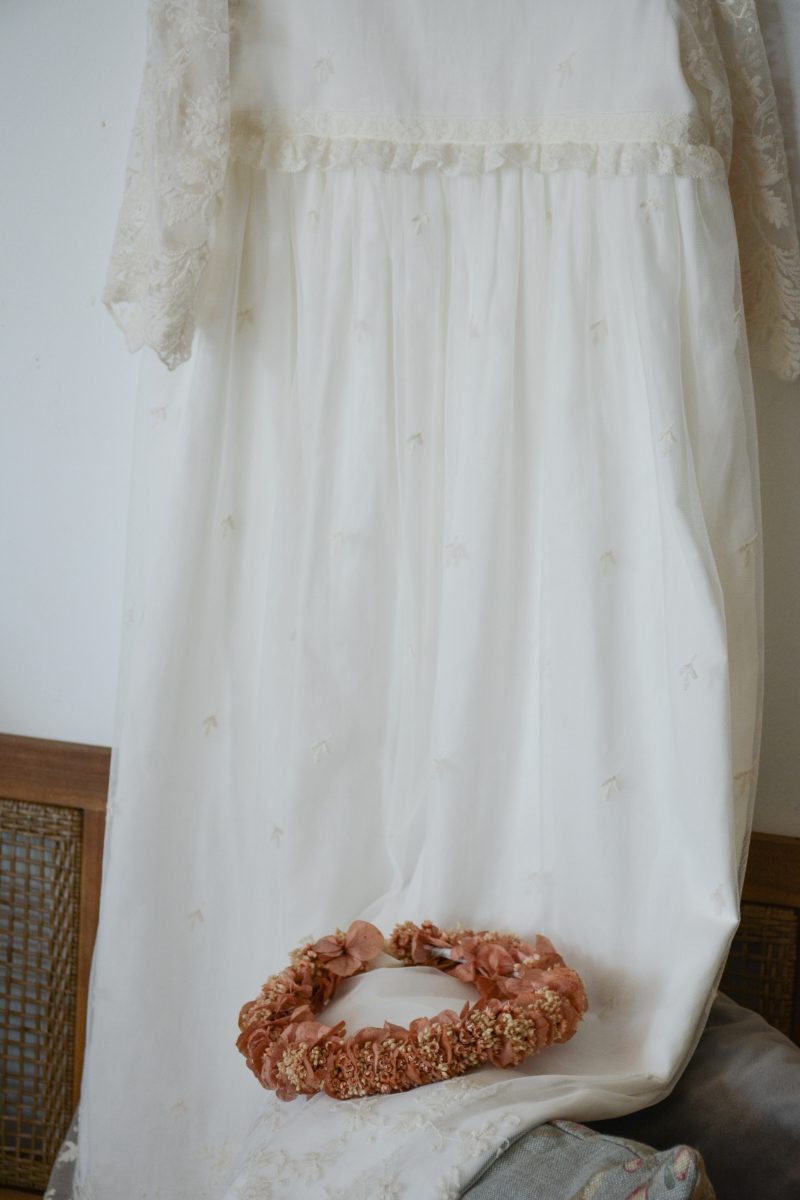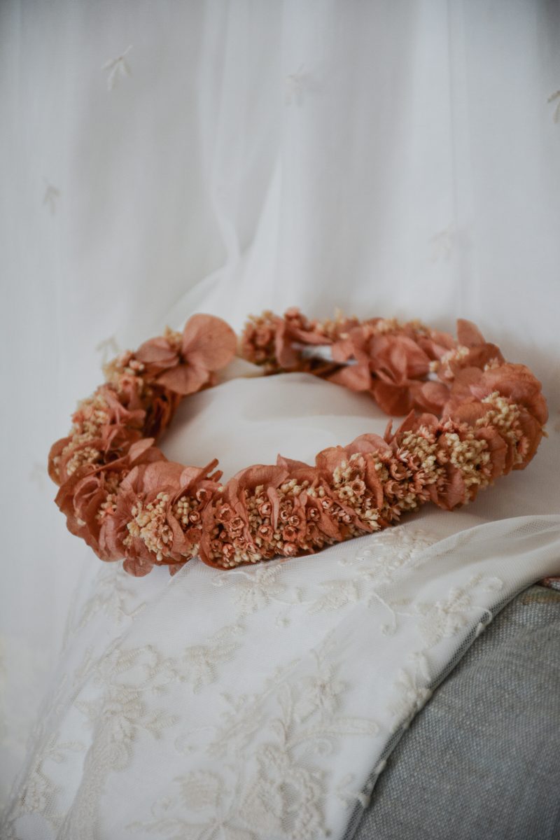 La corona de flores Elena combina la delicadeza de la hortensia preservada con flores silvestres en suaves tonos salmón y arena, logrando un diseño ligero y confortable. Gracias al proceso de preservación, conserva su color y forma intactos, haciéndola perfecta para bodas en cualquier temporada del año. Esta pieza única resulta ideal para novias que buscan añadir un toque romántico a su look nupcial.