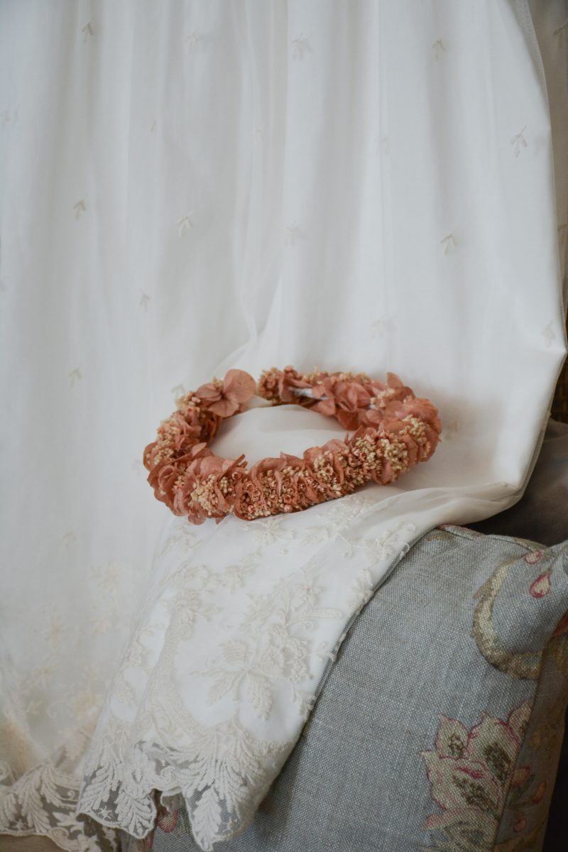 Cada Corona Elena es única, hecha a mano combinando los pétalos aterciopelados de la hortensia con pequeñas flores silvestres. Los tonos salmón empolvado aportan un toque romántico mientras que las notas arena añaden una calidez natural, creando una armonía perfecta que realza la belleza de quien la luce.
