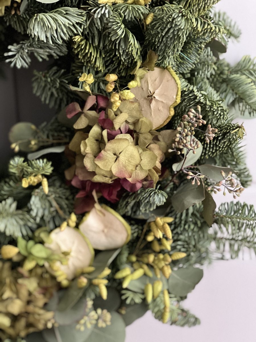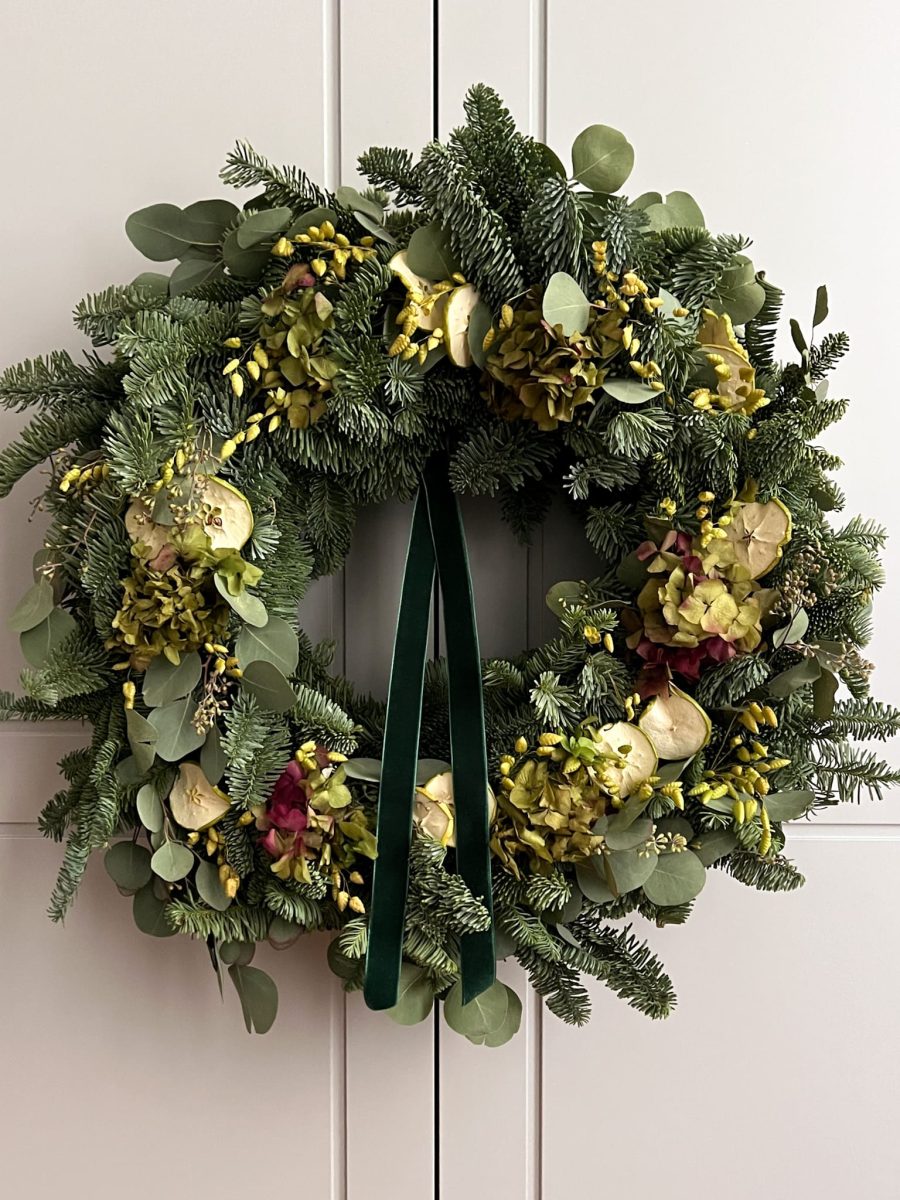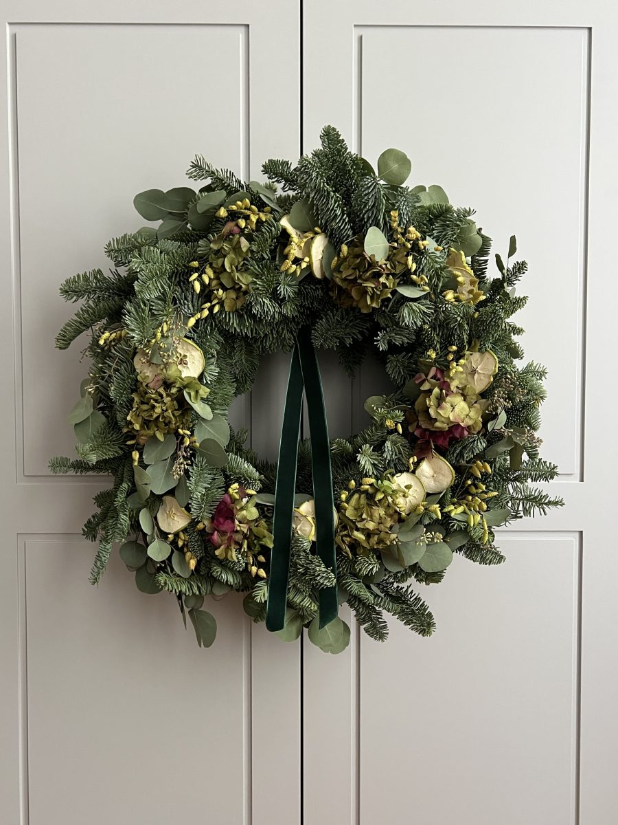 Confeccionada a mano sobre una base de paja natural seca, incorpora abeto nobilis y eucalipto fresco, que aportan volumen, aroma y textura. La composición se completa con rodajas de manzana seca, hortensia preservada en tono verde con matices burdeos y briza seca en verde suave. El conjunto se adorna con un lazo de terciopelo verde que aporta un toque sofisticado y acogedor.