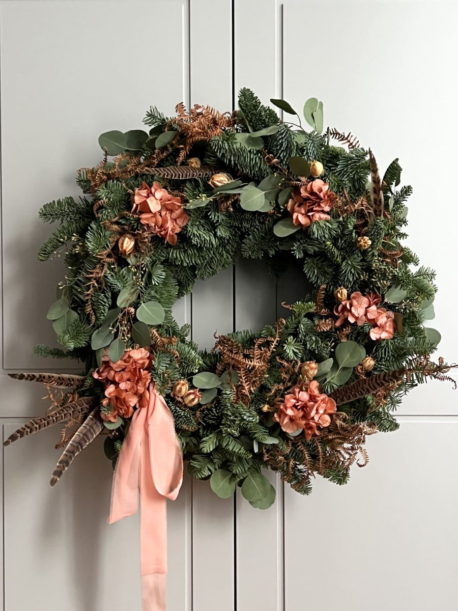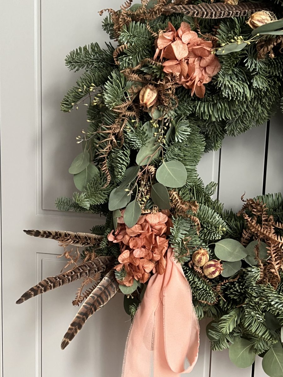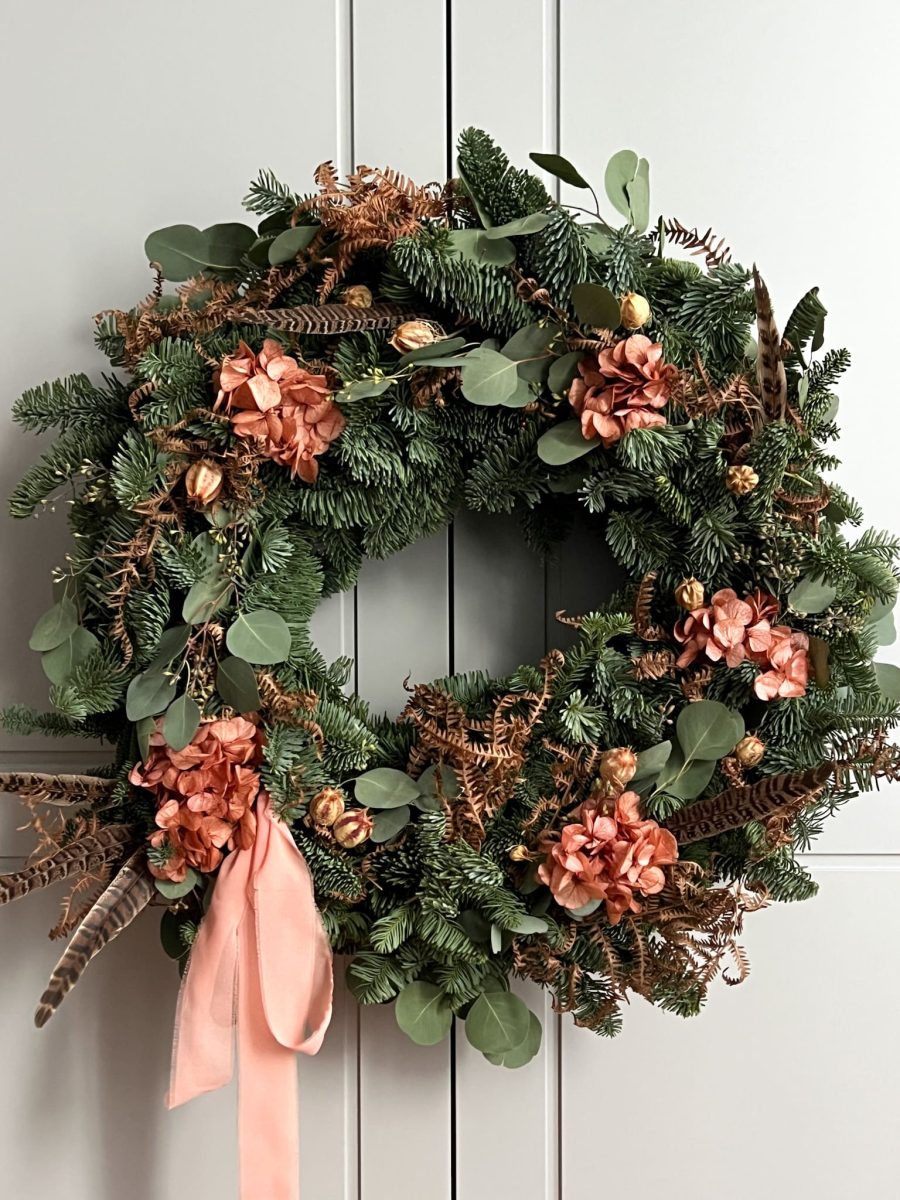 Hecha a mano sobre una base de paja natural, incorpora abeto nobilis fresco, hortensia preservada en tonos intensos, helecho seco, lino, nigella y plumas naturales. La mezcla de elementos frescos, secos y preservados crea una composición rica en textura y movimiento, que evoluciona con el paso del tiempo manteniendo su esencia decorativa.