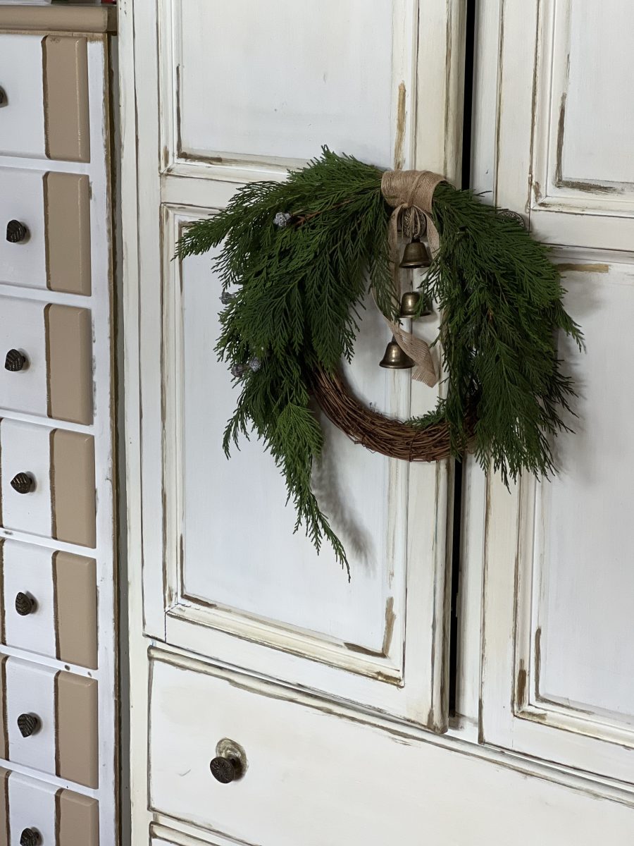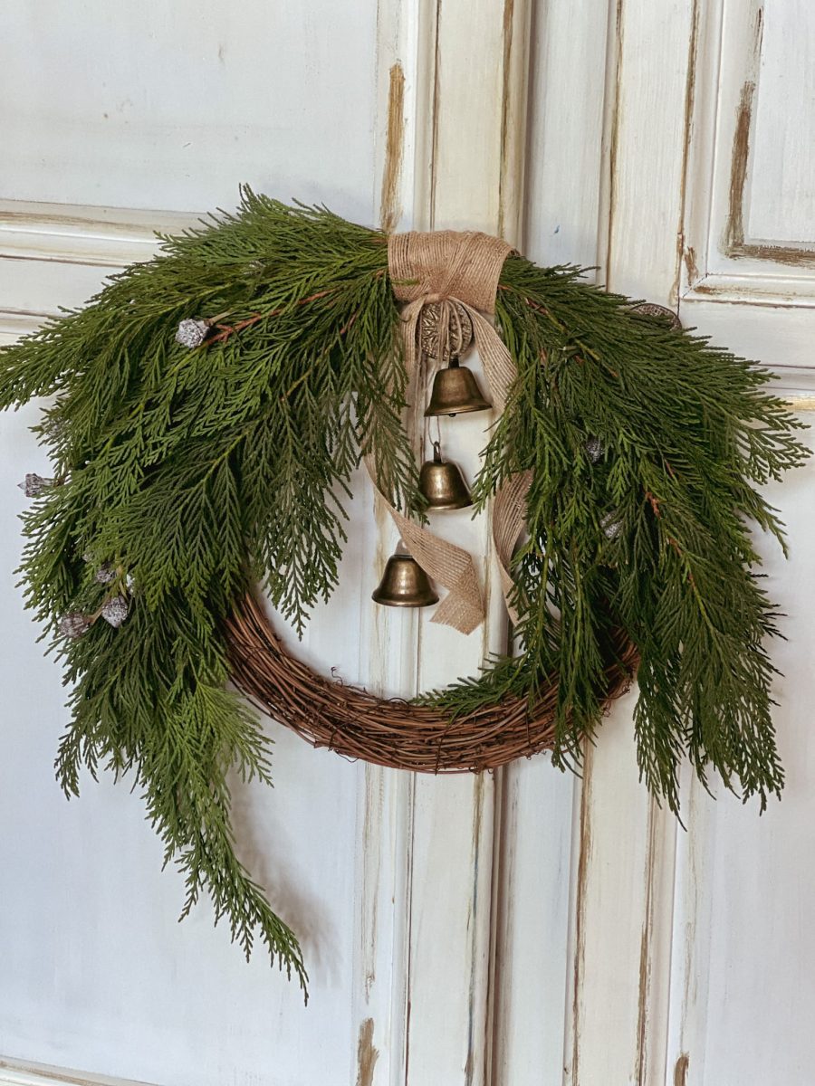 Confeccionada a mano sobre una base de paja natural, combina ramas secas, tuya fresca y un lazo decorativo cuidadosamente seleccionado en nuestro taller. Como detalle distintivo, incorpora unas pequeñas campanas metálicas que aportan un sutil toque festivo y sofisticado, sin recargar el conjunto.