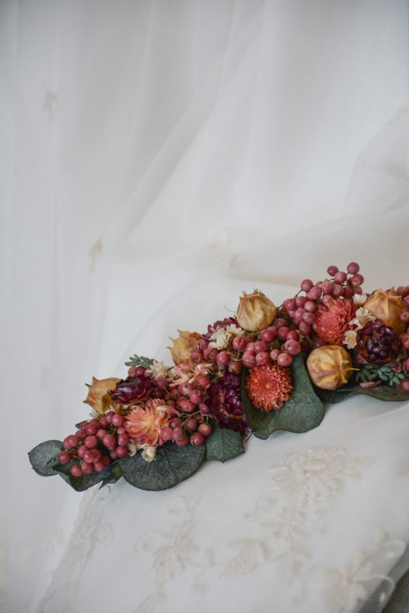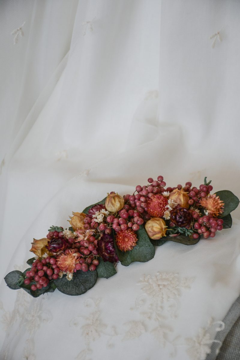 Semicorona de flores Amelie, para novias que quieren llevar un semirecogido diferente, elegante y con un toque romántico.